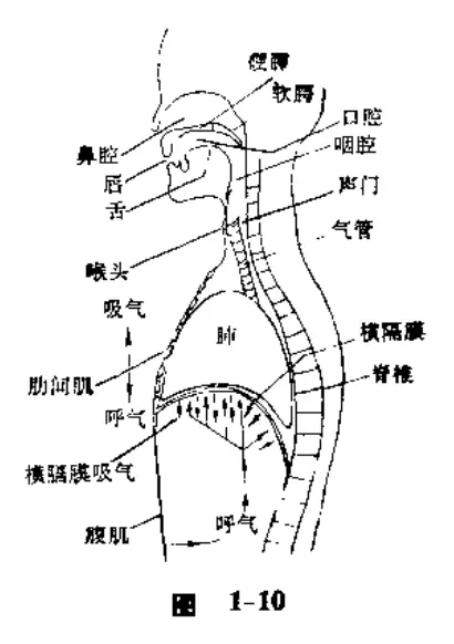 在平静呼吸时,肺气流相当稳定,一般听不见呼吸的声音,呼气和吸气时间大致相等,每分钟十六次左右,肺气压只略高于大气压。说话时胸腔活动很轻微自然,并不感到在用力,这时肋间肌是主要的呼气力,呼气放慢,使一个呼吸周期仅有约百分之十五的时间用于吸气。如果要用“一口气”说许多话,呼气和吸气的时间比例差别还要大许多。呼吸时肺气压只比大气压高出 0.25%,说话时则可高达 1%,比呼吸时提高四倍。