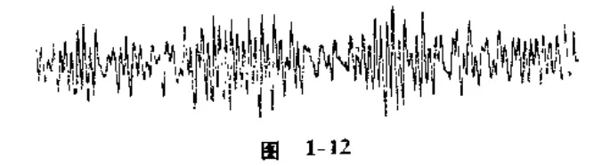 发音器官的某一部分紧缩成非常窄小的通路,气流通过时形成紊乱的湍流,产生嘶嘶的噪声,就是紊音。紊音的气流变化紊乱,没有规则,不像浊音声源那样具有周期性,所形成的声波是非周期波。普通话 s 的声波就是非周期性波,属于紊音声源。图 1-12 是 s 声波中的一小段,波形紊乱,没有周期性。