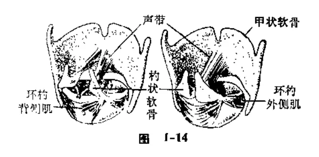 喉头由环状软骨、杓状软骨、甲状软骨以及与它们相连的肌肉和韧带组成。环状软骨处于喉头下部,与气管相连,形状像一个前低后高的指环。杓状软骨在环状软骨后面高出的部分之上,分为左右两块,像两个椎形的小构。甲状软骨最大,分为左右两块。在喉头前部合在一起,略向前突,形状像盾甲,成年男子突出较明显,从颈的外部就可以看出来,通常称为喉结。喉头的构造如图 1-13 所示: