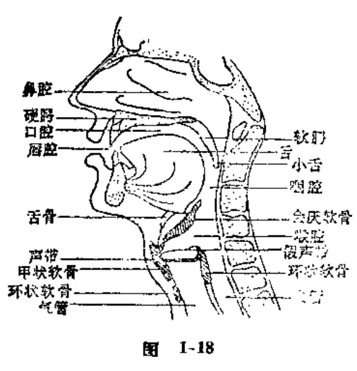 严格地讲,由声带颤动而产的声带音是通过喉腔,咽腔、口腔、唇腔和鼻腔这五个共振腔才传到人的耳朵里。喉腔、咽腔、口腔,唇腔和鼻腔组成人类发音器官的声腔,是非常灵活富于变化的共振腔。声带音通过声腔时,由于声腔形状的种种不同变化,产生不同的共振,形成种种不同的声音。图 1-18 是人类声腔的横剖面图。