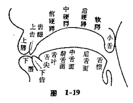 口腔是人类发音器官中最重要的部分,发音活动的一切复杂变化都是在口腔里进行的,这是因为发音器官里可以活动的部分几乎都集中在口腔里,其中包括唇、舌、软腭和小舌。这些可以活动的部分可以改变口腔的形状、容积和气流的通路,使声带音产生种种不同共振;也可以和固定部位接触,形成种种不同阻碍,使气流不能顺利通过,成为紊音和瞬音产生的声源。图 1-19 是口腔示意图,其中除牙齿、齿龈和硬腭外,都是能活动的。
