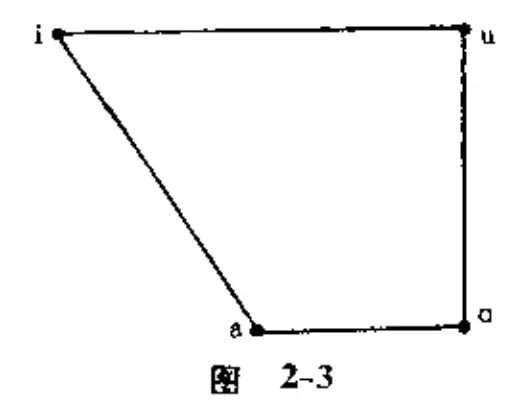 图 2-2 中的**黑点表示舌面隆起的最高点,是前后两个声腔的分界处,代表舌位。**这三个元音舌位的高低和前后都不相同,形成一个不等边三角形,在图 2-2 中用虛线来表示。口腔的横向长,纵向短,开口处宽,舌根和软腭相对处窄,再加上舌头肌肉组织所起的牵制作用,使得舌位的高低和前后的关系互相影响。例如,i 和 u 都是高元音,但因为 u 同时是后元音,舌位受到舌头后缩的影响、就要比前元音 i 的高度略低。同样,舌头放低后,舌位前后移动的范围就变小,发 a 时虽然舌头也可以前后移动,但比 i 和 u 之间的舌位距离小得多。在发元音时舌位的活动范围实际上形成了一个不等边的四边形,这个四边形代表了发元音时舌头活动的外围极限,一般用图 2-3 的图形来表示图中四角的四个字母代表极限,一般用图 2-3 的图形来表示,图中四角的四个字母代表极限的四个点。这四个字母是国际上通行的国际音标所采用的,为了区别于其他拼音字母,按照国际习惯,国际音标的符号外加方括号,即[i][u][a][ɑ]等等。国际音标是国际语音学协会拟订的,经过一百多年的修订和补充,已成为国际上最通行的标写语音的符号。