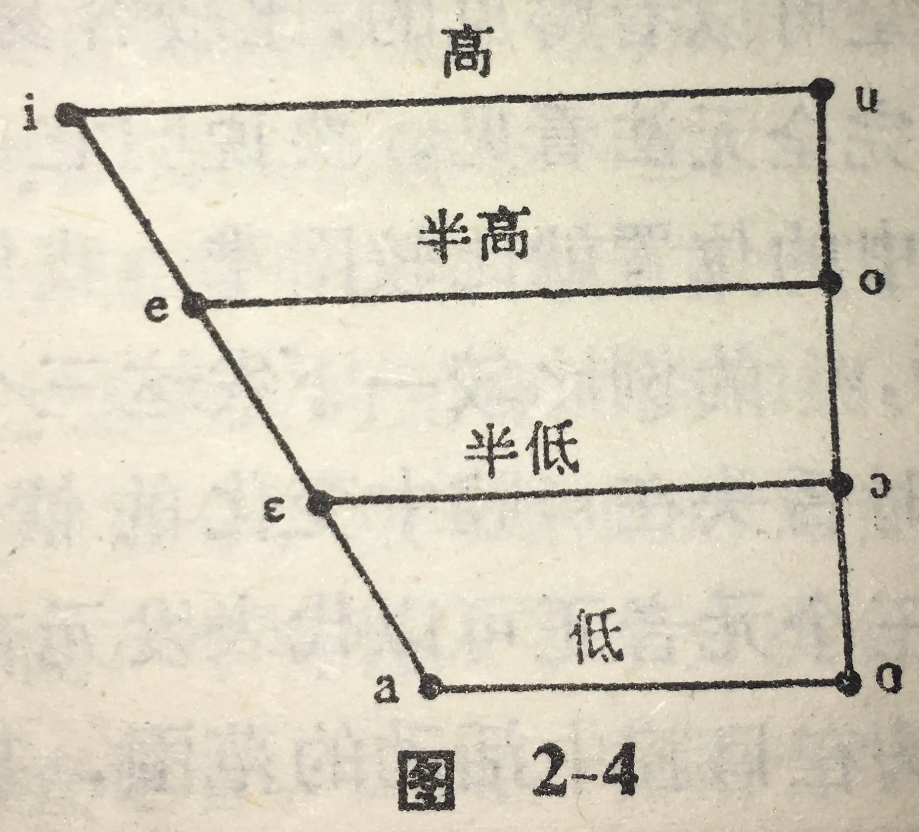 图 2-5 中舌位的高低分为高、半高、半低、低四度(前元音在四度之间增加[ɪ][ᴇ][æ]三个音标,实际是分为七度),**舌位的前后分为前、央、后三度,圆唇和不圆唇并列,圆唇元音在线右,不圆唇在线左,**共列出 21 个常用国际音标。下面逐一描写这 21 个元音的音值,并举出北京话的例字作为练习发音时的参考,北京话没有的元音,举常见汉语方言中的例字。