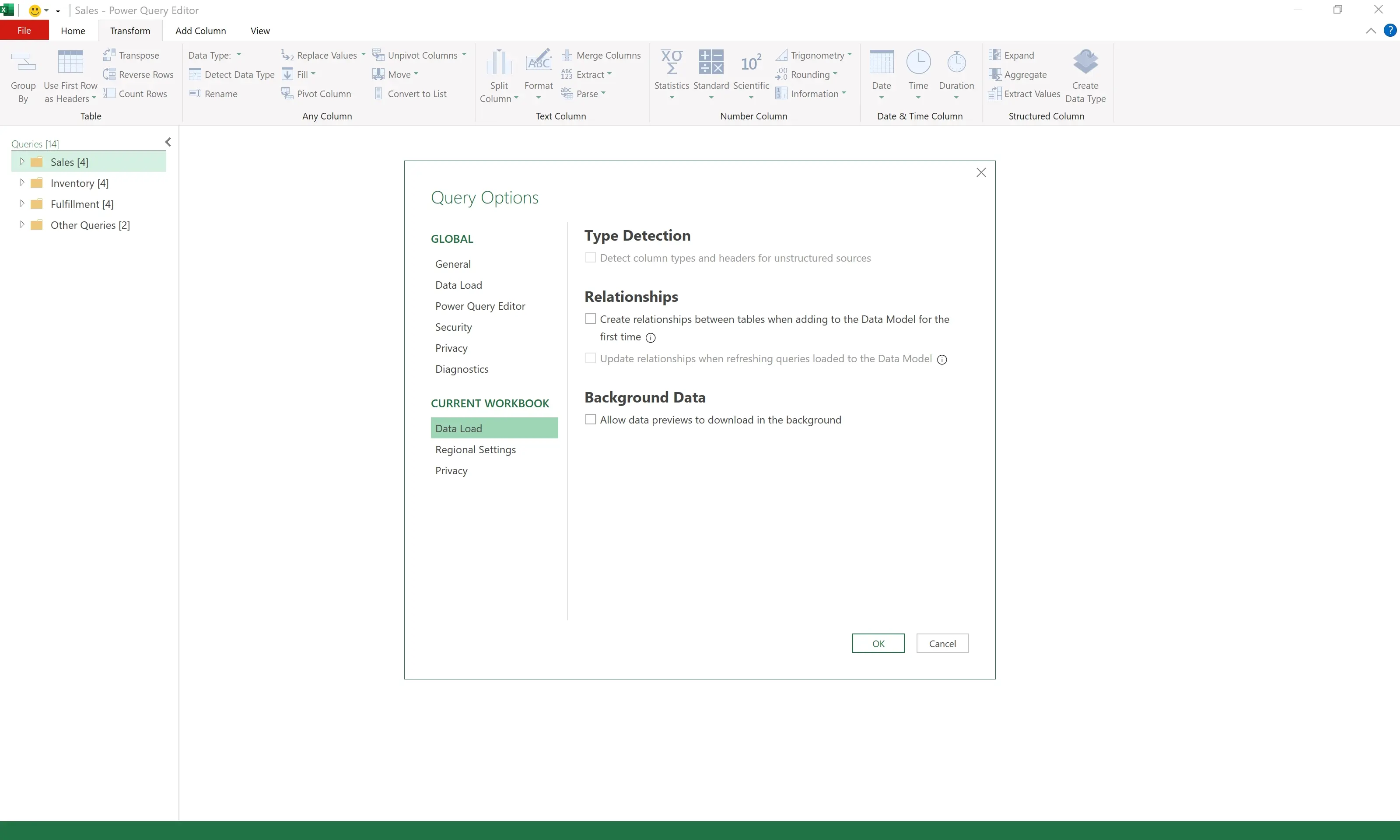 - Excel > Power Query Editor > File > Options and settings > Query Options > GLOBAL > Data Load