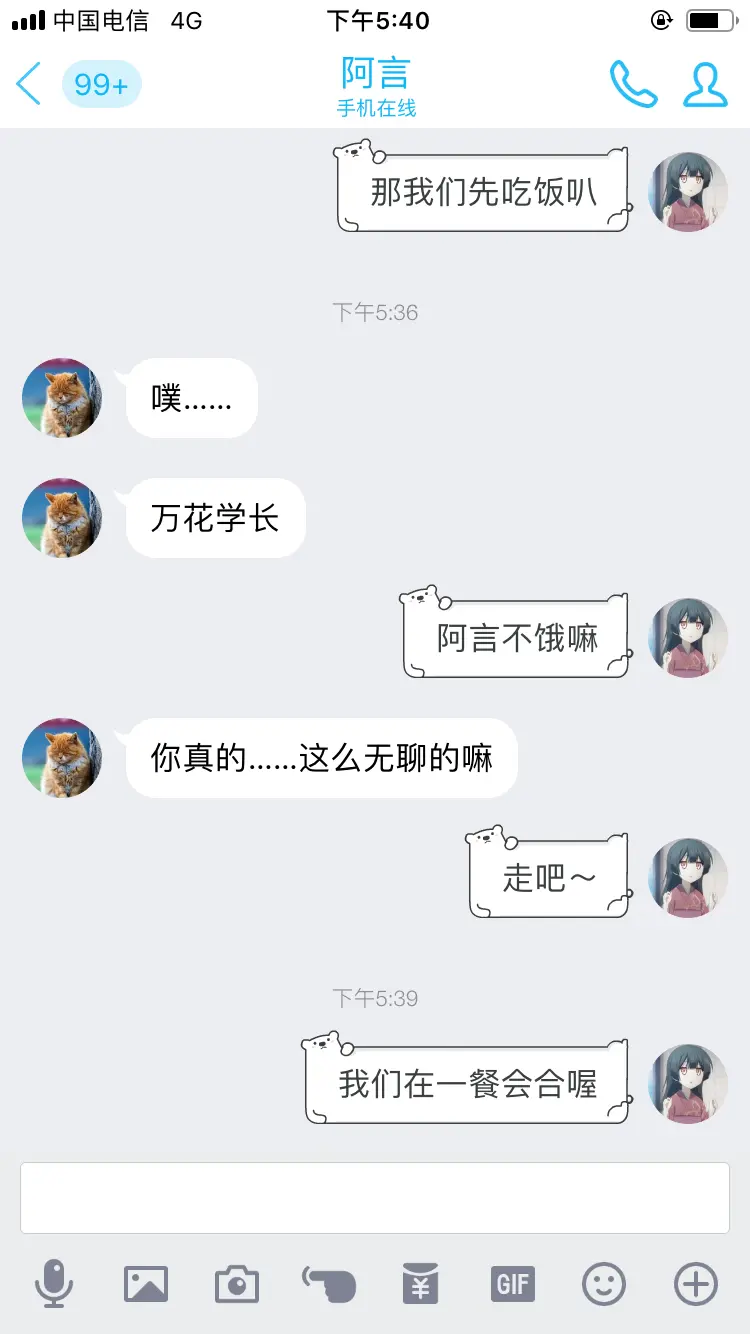 少年心事 发表于 2019-04-12 更新于 2019-04-15 分类于 随笔 阅读次数 评论数 这星期偶然遇见了上学期追求的两个妹子,都不是同一学院的,从朋友更进一步也都失败了。 她们仍旧单身,等待着那个灵魂相合的人。 打开聊天窗口,只敢点进空间关照她们的生活。 一个期中了,还是配不上这两个优秀的女生呢。 我还需要时间体验、积淀、成长,成为一个能够依靠的男人。 1月9日与阿言初识点击显示/隐藏聊天图片
