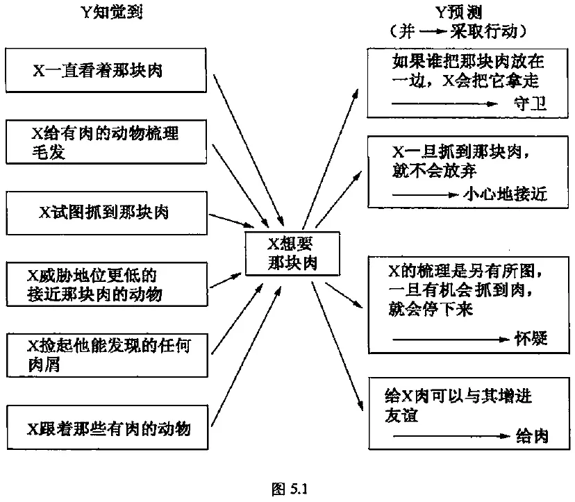 或许在某些物种里,开始出现外显式泛化这一高明创新,允许在新情况出现时,根据第一原则的要求将清单拆解并重建。看一下怀腾关于一个动物对另一个动物所持的特定欲求的内部表征图示。