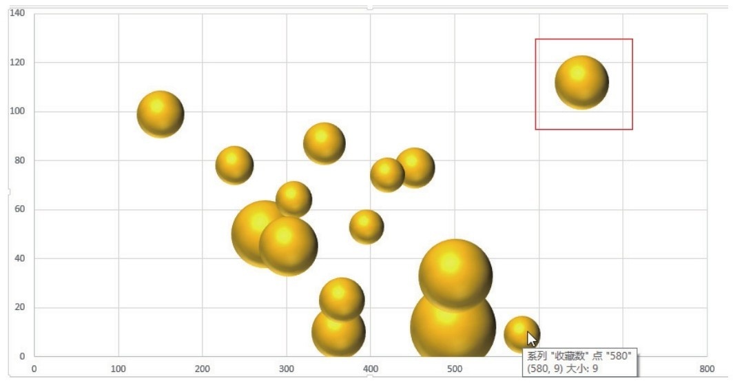 又如下图中红色线框中所示的气泡,它的访客数是最多的,收藏数也最多,属于正常情况。但是它的下单件数并不是最大的,可见想要购买该宝贝的买家数较多,但是却出于什么原因迟迟没有下单。那么卖家就可以分析,是不是宝贝的售价太高,如果是,就去分析市场,将价格调整到顾客所能接受的程度。卖家还可以对该宝贝进行促销活动,刺激顾客的消费,让宝贝的销量得以提升。