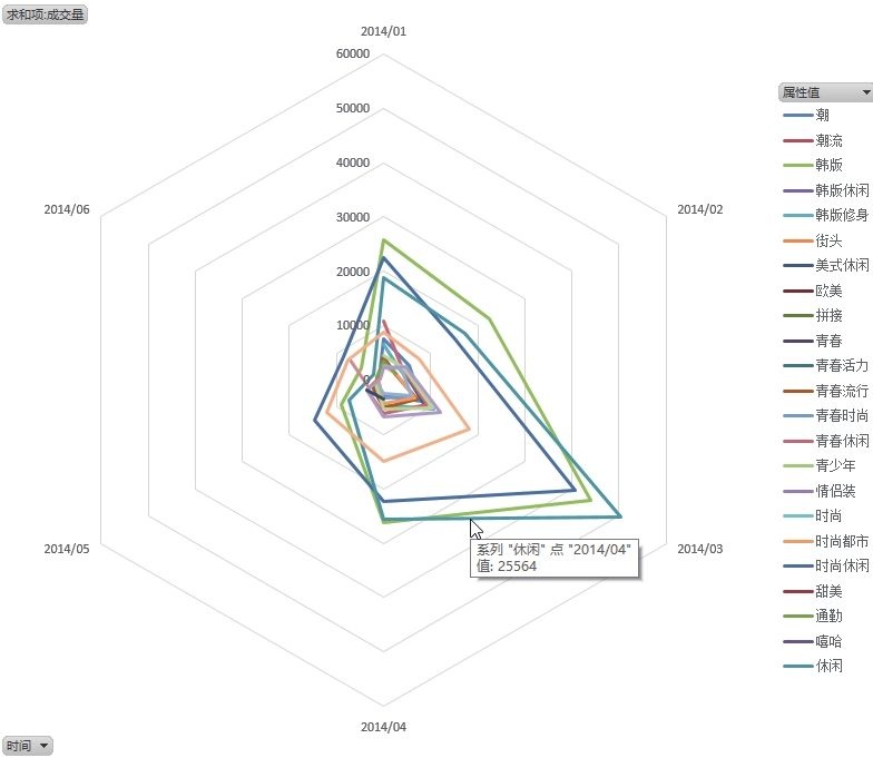 创建好的雷达图如下图所示,从图中可以非常直观地看出数据所在年份的上半年,6 个月内分别是什么属性的商品最受欢迎。例如在 3 月,是“休闲”属性的商品成交量最大,也就是最受市场欢迎,但是该属性的商品在 1 月却不如“韩版”属性的商品受欢迎。总的来说,在该年份上半年中,“韩版”“休闲”“时尚休闲”是最受欢迎的男装三大属性。卖家可以以此为依据来设计来年上半年店铺中男装宝贝的属性卖点。