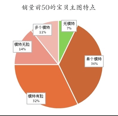 从左下图宝贝主图特点中,可以得知,这些排名靠前的宝贝主图只有很少的一部分没有模特,可见有模特的主图对顾客的吸引力比较大;而这些有模特的主图中,单个模特主图的数量几乎是多个模特主图数量的两倍,可见,主图的模特不在于多,而在于精;还可以发现有一小部分主图图片中的模特脸部是看不见的,有的卖家之所以选择这样做,是想让顾客的注意力集中在宝贝本身上,而不是模特身上,但是经过统计发现模特脸部完整的主图数量是无脸模特数量的两倍。总结一下:销量靠前的宝贝主图大都是单个脸部完整模特。
