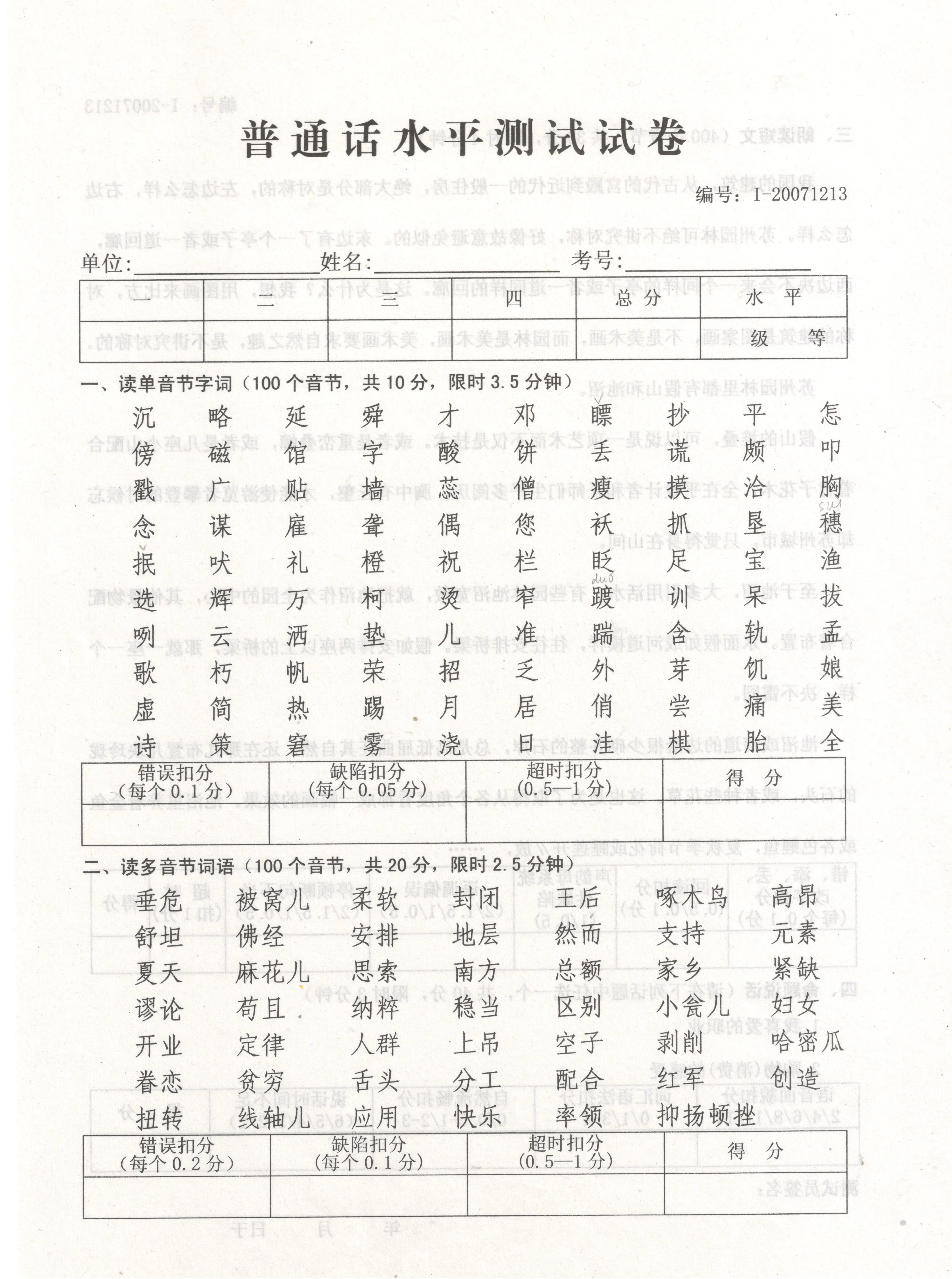 提示:普通话水平等级测试试卷包括五个部分:读单音节字100个;读多音节词语;选择判断;朗读短文;命题说话。分值100分。其中第四部分,选择判断涉及普通话词汇和语法,只在南方方言区考察,北方方言区大部分省区对选择判断不做测试要求。