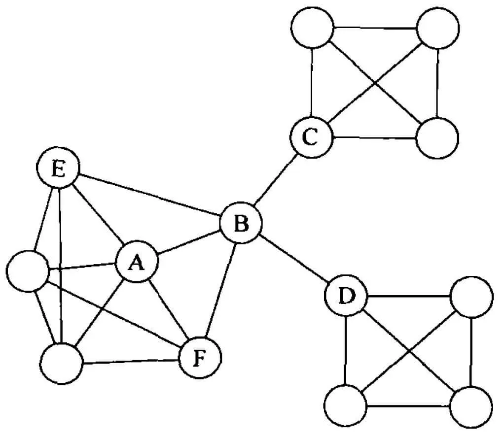 这最后一点表明了节点 B 的利益不一定与其所属的群体整体的利益一致。对于组织机构而言,促进不同群体间的信息交流是有益的,但联系桥梁的建立会有损 B 自身在这些群体边界的权力。