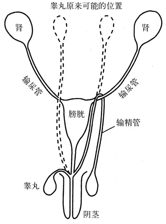输精管是从睾丸往阴茎运送精子的管道。图片左侧所示是设想的最直接的运输路线。输精管实际采取的路线,则是此图右侧所示。输精管采用了一条荒谬的弯路,上行绕过输尿管(将尿液从肾脏输送到膀胱的管道)。如果这是设计而成的,那么没有人能理直气壮地否认这样一个事实,即这个设计师犯了一个严重错误。但是当我们着眼于进化历史时,一切都变得清楚明白了。图中虚线所示的是睾丸原来可能的位置。在哺乳动物的进化过程中,睾丸下降到了其现今所在的阴囊中的位置(原因往往被认为与温度相关),于是输精管便搭到了输尿管的上方——不幸地陷入了歧途。“进化”没有像任何明智的工程师都会做的那样,重排管道,而是简简单单地继续延长了管道的长度——同样,每次因“弯路”的小小延长而增加的边际成本都很小。这又是一个关于纠正初始错误的绝佳事例,其纠正过程通过“事后补偿”而非“重回绘图板”的方式得以实现。