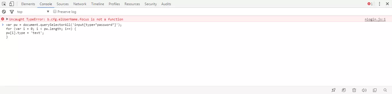 使用 JS 代码查看加密密码 发表于 2017-04-30 分类于 软件技巧 阅读次数 评论数 浏览器自动填充密码,密码显示小圆点,可通过 js 代码来显示,此方法适用于大多数网站,以下示范 网站:淘宝网 浏览器:360极速浏览器 v8.7.0.306 按F12调出开发者工具,切换到Console控制台,粘贴下列代码 1234var pw = document.querySelectorAll('input[type="password"]');for (var i = 0; i < pw.length; i++) {pw[i].type = 'text';} 回车显示密码